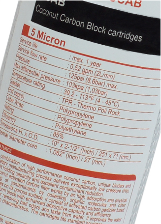 Κατάλληλο για την αφαίρεση δυσάρεστων οσμών και ανεπιθύμητης γεύσης από το νερό, βελτιώνει τα οργανοληπτικά χαρακτηριστικά του νερού, συγκρατεί ακαθαρσίες και σωματίδια μεγέθους έως 5 micron.